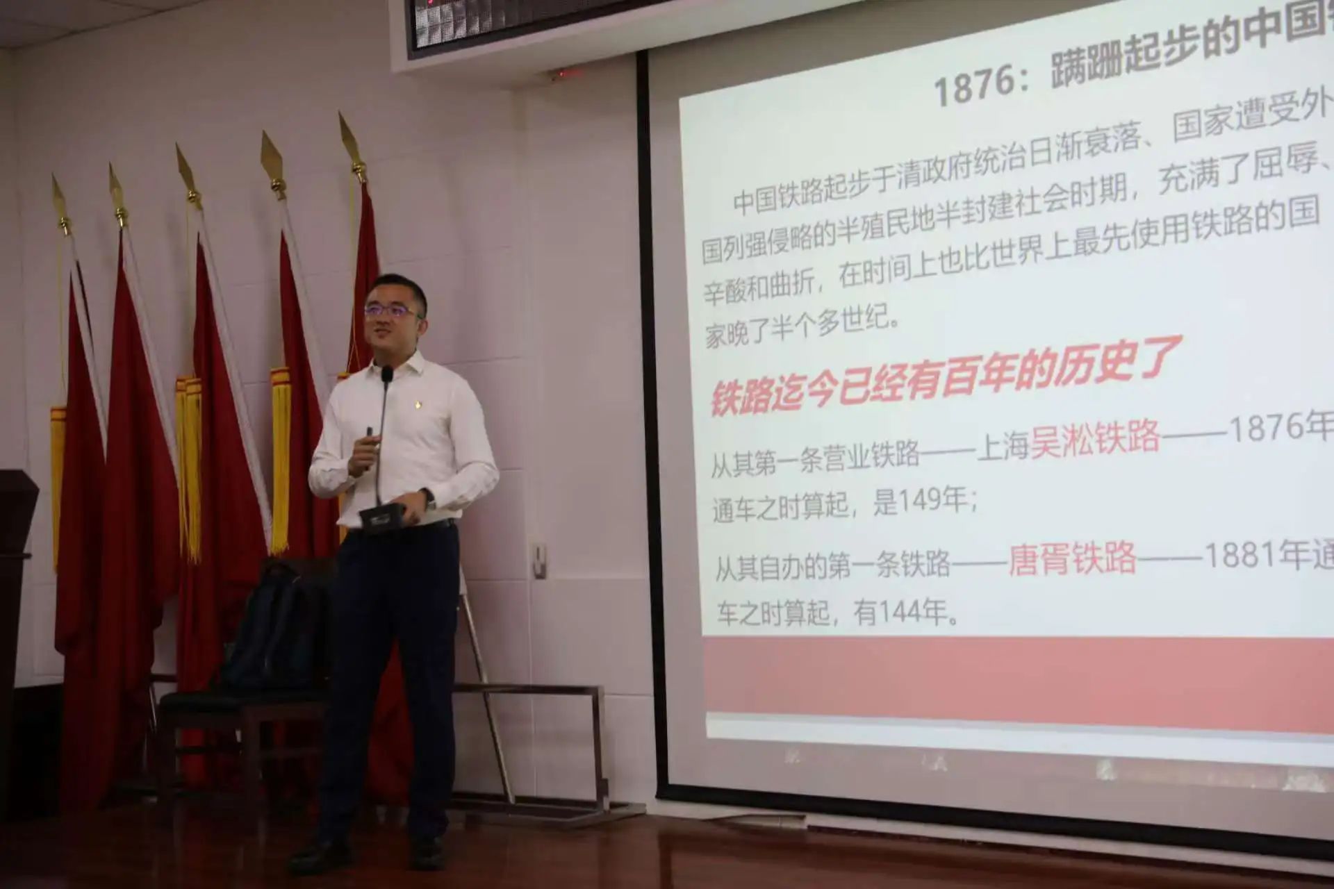教师王建宇走进大连车务段,以《严守中央八项规定精神 夯实作风建设》为题开展党课交流,这是麻豆传媒a片