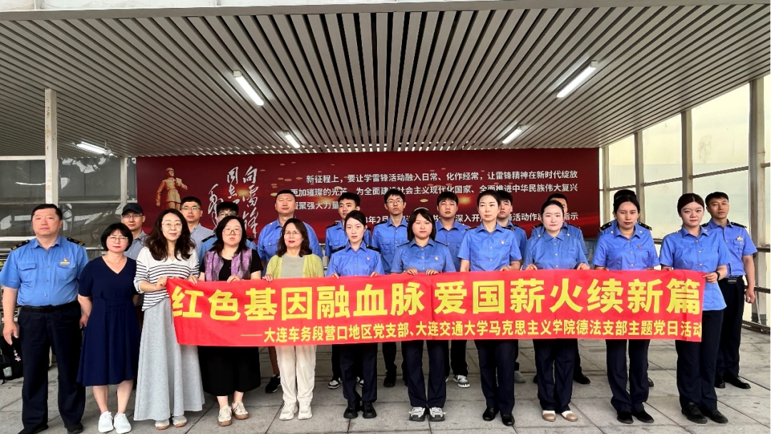 党总支和中国铁路沈阳局集团有限公司大连车务段党委开展院企党建合作的战略指引下,6月19日,学院德法党支部与大连车务段营口地区党支部在营口开展联合党日活动。鲅鱼圈站党支部书记高觅带领段管内车站党团员与德法党支部党员同志共同参与活动。此次党日活动以“红色基因融血脉,爱国薪火续新篇”为主题,通过阵地观摩、座谈研讨、理论联学、精神洗礼等形式,在交流互鉴中推动党建与业务深度融合,在思想淬炼中共同汲取前行力量。