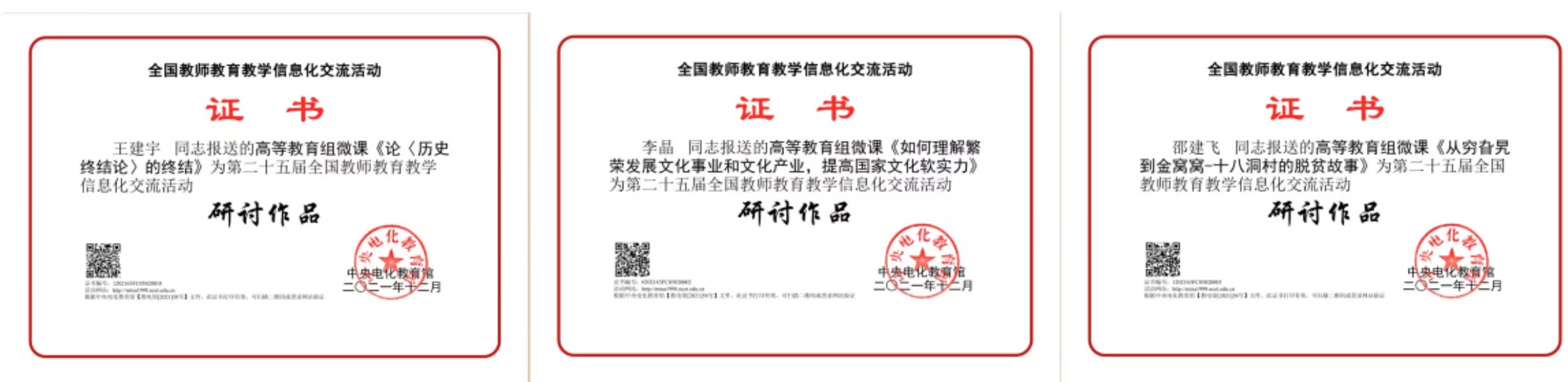 3位教师获得优异成绩。其中,邵建飞老师微课作品《从穷旮旯到金窝窝—十八洞村的脱贫故事》、李晶老师微课作品《如何理解繁荣发展文化事业和文化产业,提高国家文化软实力》、王建宇老师微课作品《论<历史终结论>的终结》,在评选中荣获微课类“研讨作品”奖。