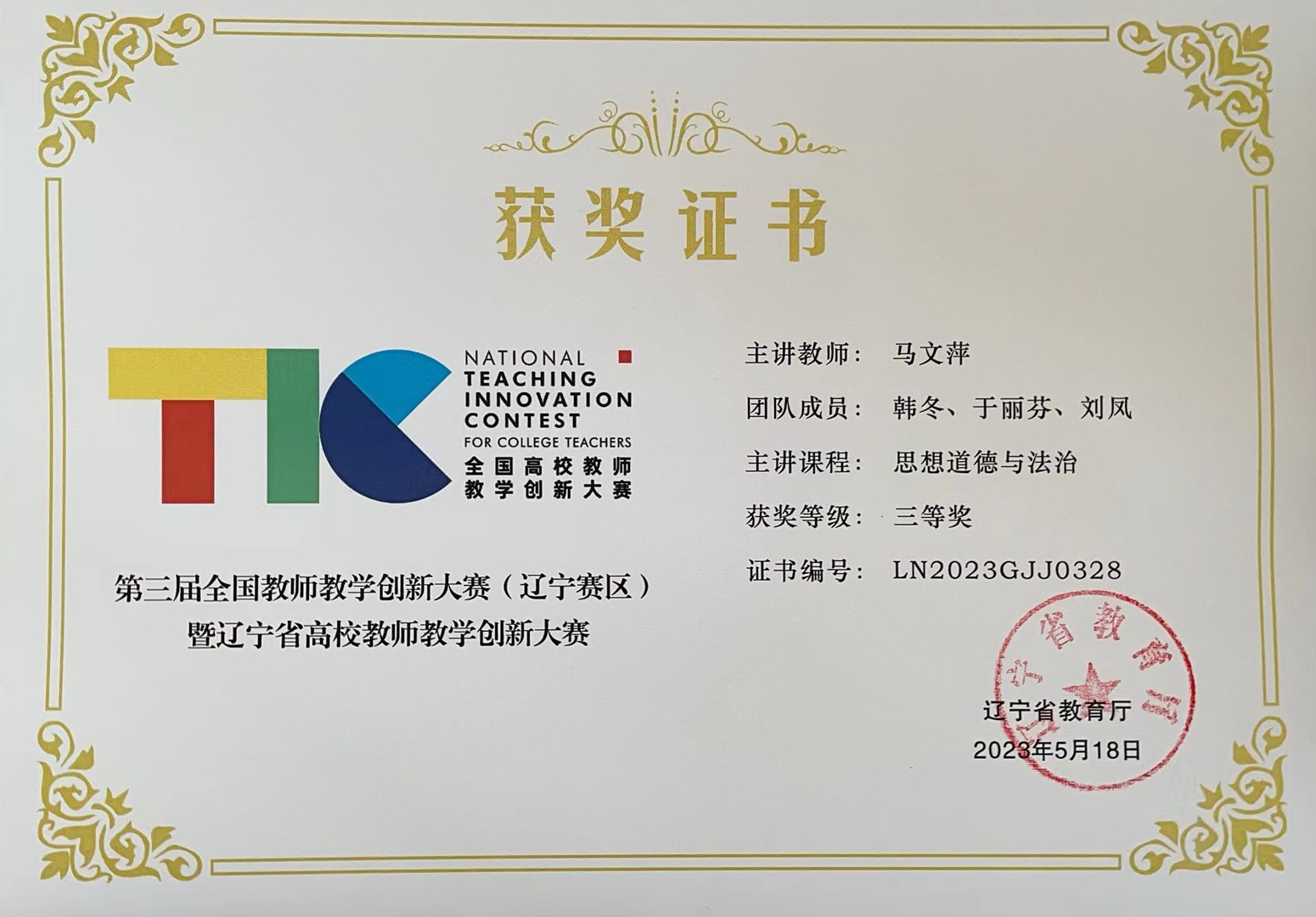 近日,辽宁省教育厅公布2023年辽宁省高校教师教学创新大赛获奖名单,麻豆传媒a片 “思想道德与法治”课程教师团队获得三等奖,团队成员包括马文萍、韩冬、于丽芬和刘凤4位教师。